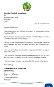 تقدم السويسري جياني إنفانتينو رئيس الاتحاد الدولي لكرة القدم، فيفا، والجنوب أفريقي باتريس موتسيبي رئيس الاتحاد الأفريقي لكرة القدم، بالتهنئة للمهندس هاني أبوريدة، عضو مجلس الفيفا والمكتب التنفيذي للكاف، بانتخابه هو وقائمته لقيادة اتحاد الكرة المصري خلال السنوات الأربعة المقبلة وحتى عام ٢٠٢٨.