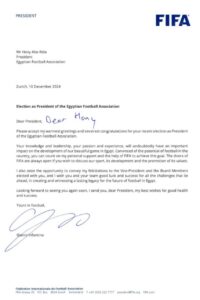 وقال إنفانتينو في خطابه لرئيس اتحاد الكرة المصري الجديد، إنه يثق في أن خبرته وقيادته ستقود الكرة المصرية واللعبة الشعبية الأولى إلى التطور والتقدم، وأن وجوده على رأس قيادة الكرة في مصر، ستساعد الفيفا على تحقيق أهدافها في تطوير اللعبة في مصر، وأبواب الفيفا مفتوحة دائما أمامه لمناقشة أي تطوير في كرة القدم مستقبلا بخوص الكرة المصرية.