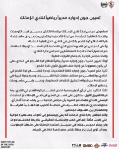 الزمالك يعيّن جون إدوارد مديرًا رياضيًا ويمنحه صلاحيات كاملة لإدارة شؤون الكرة